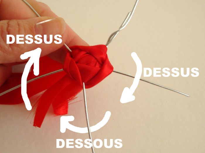 Gelelim yapılışına: Fotoğraftan da anlaşılıyordur ama ben yine de yazayım (yaparken fotoğraflamayı unutmuşum, özür!).Tellerden veya açılmış ataçlardan beş kollu bir yıldız oluşturuyoruz. Kurdeleyi ortada bir düğümle sabitledikten sonra tellerin etrafından, bir üstten bir alttan doluyoruz. İstediğimiz büyüklüğe gelince de kurdelenin ucunu arkaya dikerek veya yapıştırarak tutturuyoruz. Tellerin de uçlarını arkaya kıvırıyoruz. Sonra da güzel çiçeklerimizi istediğimiz yere konduruyoruz.